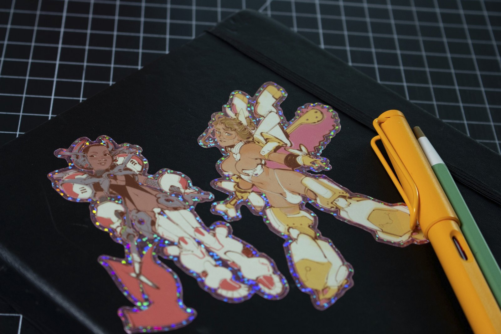 4.5" in. (H) x 3.5" in. (W) - This glossy finish sticker has a sparkly✨glitter✨ backing that peeks through the design.