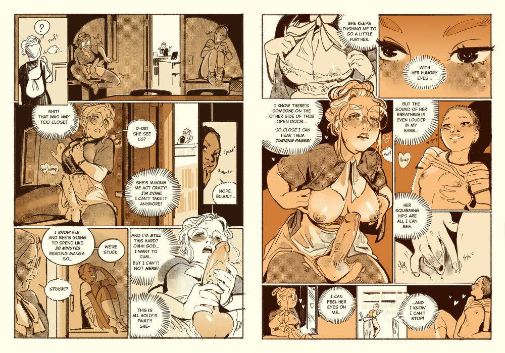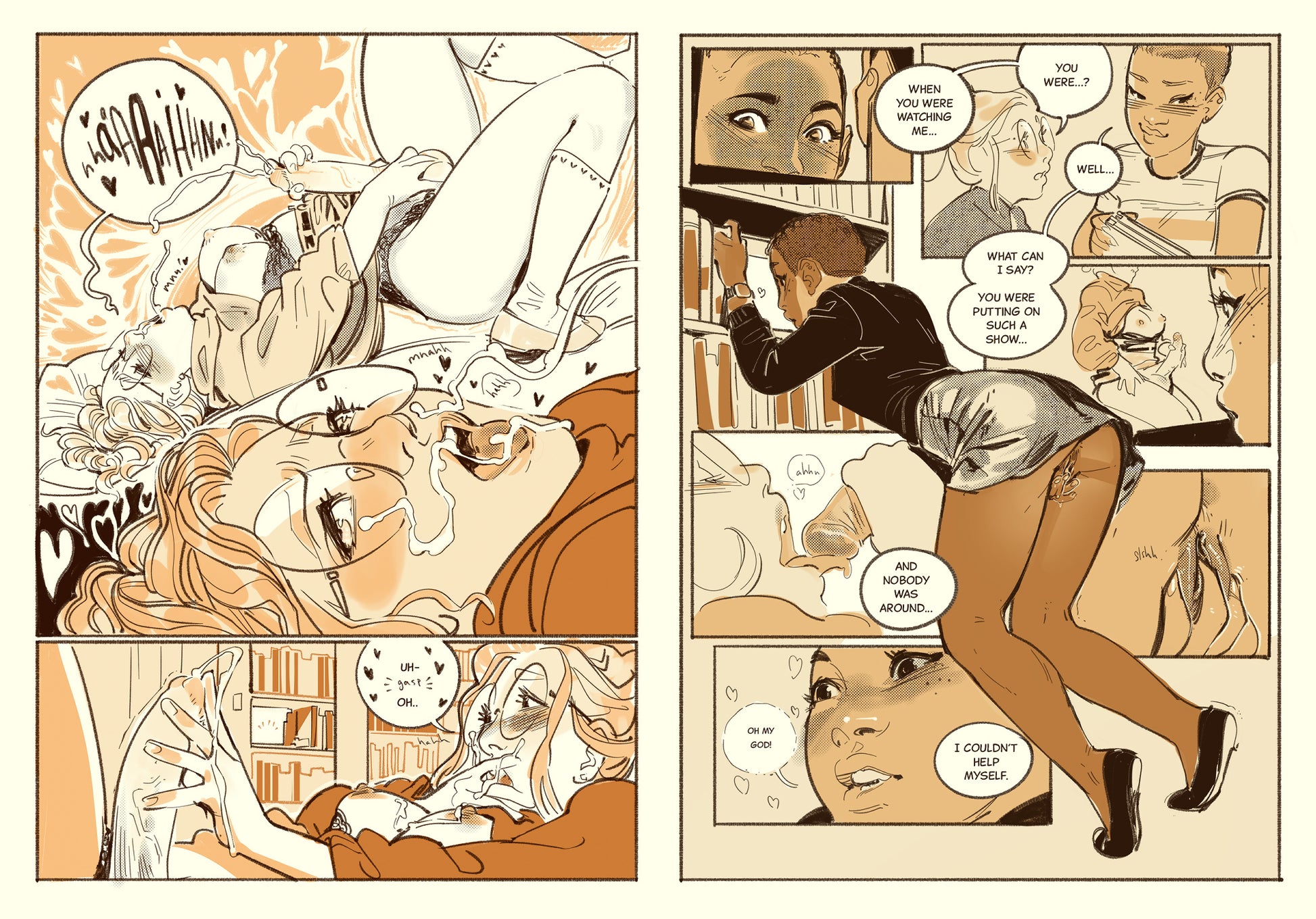 Libby & Holly is a romantic erotic comic about a transfemme librarian named Libby and her loving tormentor Holly. What begin as a chance encounter inside the university library escalates into a series of tense and tender erotic situations that bring them together. ❤️